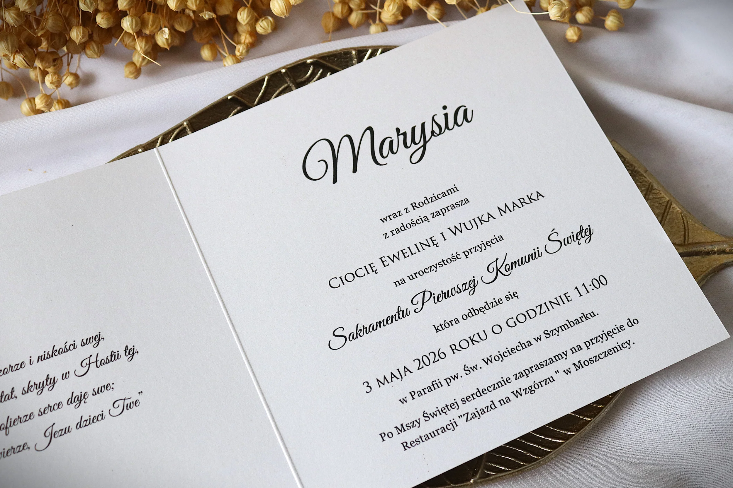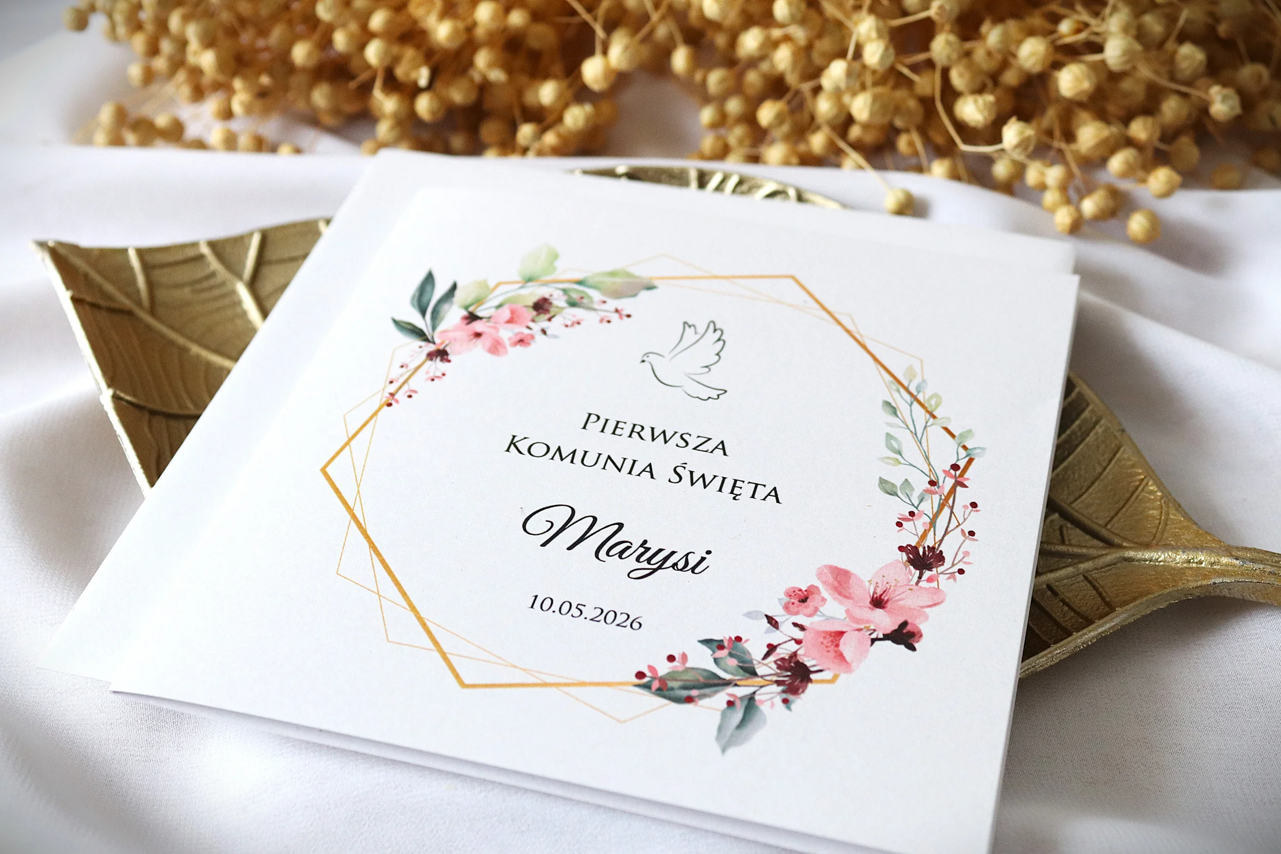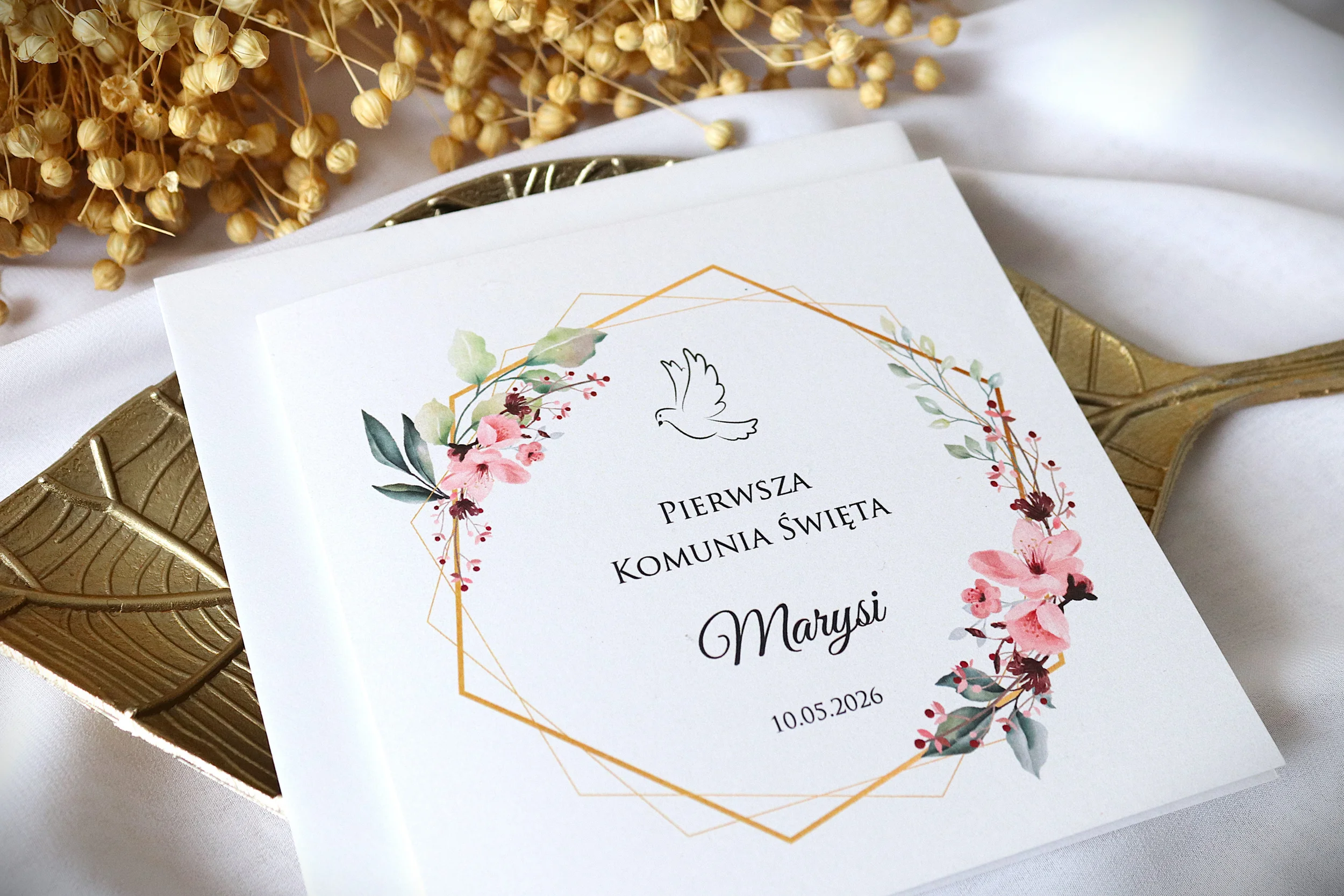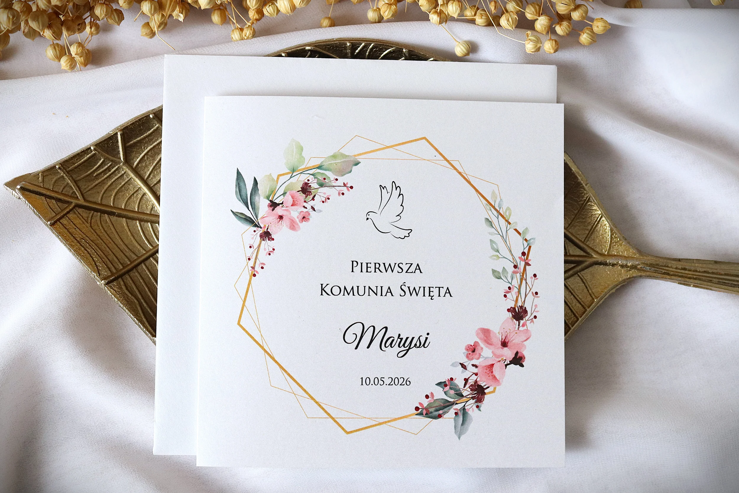 Projekt opiera się na geometrycznej formie, która porządkuje kompozycję i nadaje jej lekkości. Całość uzupełniają drobne, różowe kwiatuszki, wprowadzające subtelny, dziewczęcy akcent. Zaproszenie idealnie sprawdzi się więc jako zaproszenie na Komunię lub Chrzest dla dziewczynki, zachowując przy tym elegancki i stonowany styl.