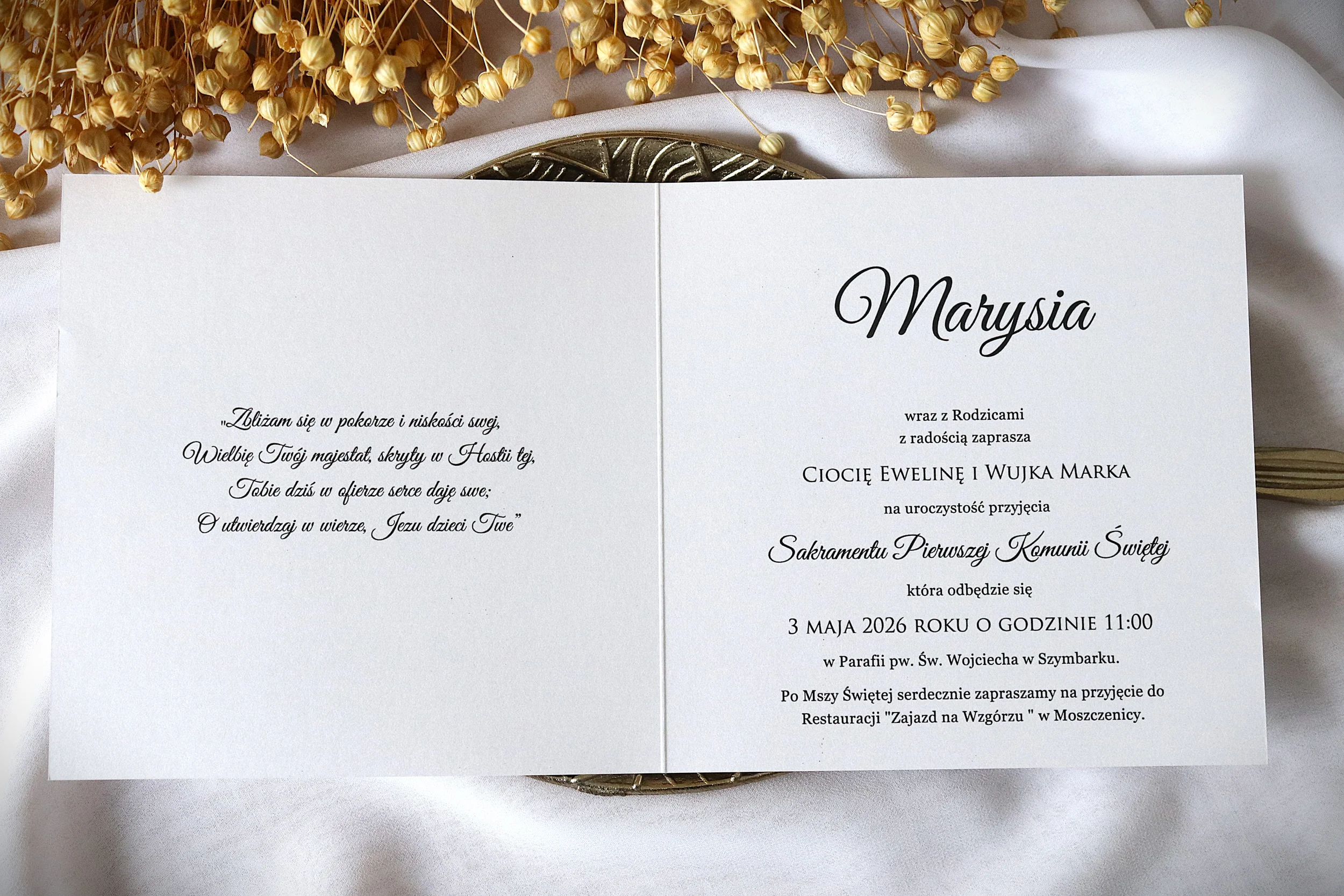 W środku znajduje wierszyk dopasowany do charakteru uroczystości, zarówno Pierwszej Komunii Świętej, jak i Chrztu Świętego. Tekst wprowadza uroczysty nastrój i podkreśla wyjątkowość wydarzenia, pozostając przy tym prosty i czytelny.